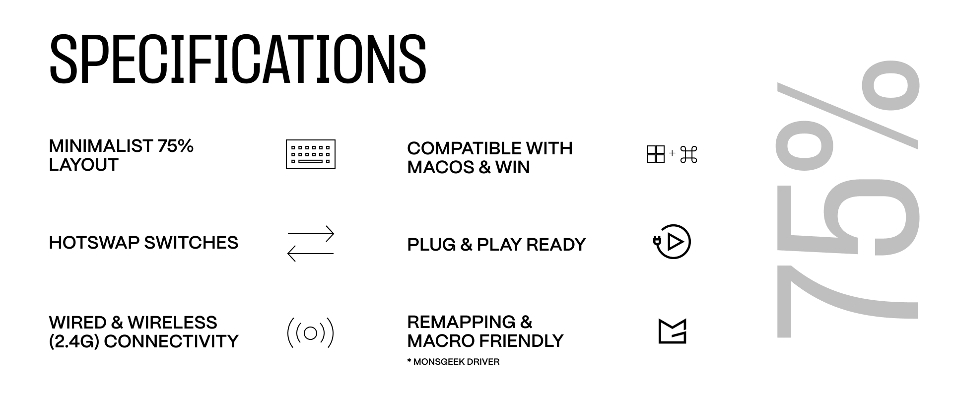 The Monsgeek MG75W keeps things simple and solid. With dual-mode connectivity and hot-swappable support, it’s built for those who want a dependable 75% keyboard that looks good and gets the job done — no extras, just performance.